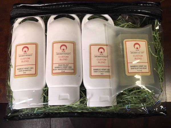 This CBD Travel kit contains a 2 oz size Bamboo Hemp with CBD Shampoo, a Bamboo Hemp with CBD Conditioner, a  Bamboo Hemp Massage Lotion with CBD and a 1.5 oz Bamboo Hemp with CBD Exfoliating Soap in a plastic travel pouch.